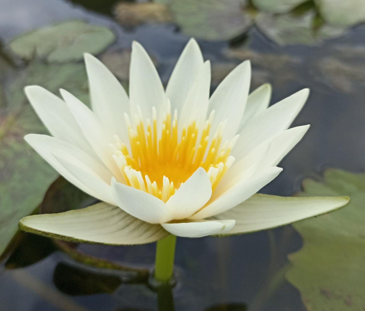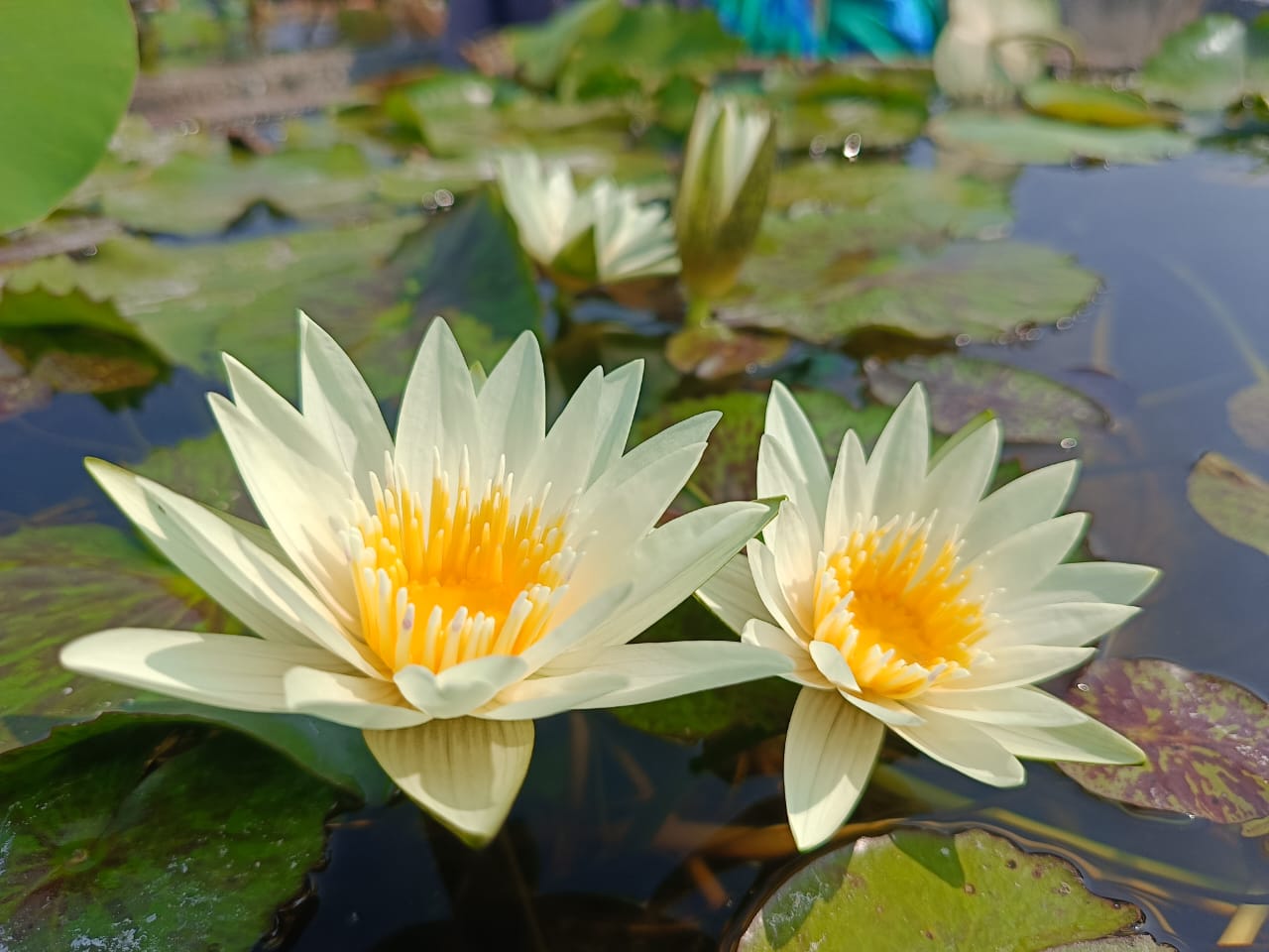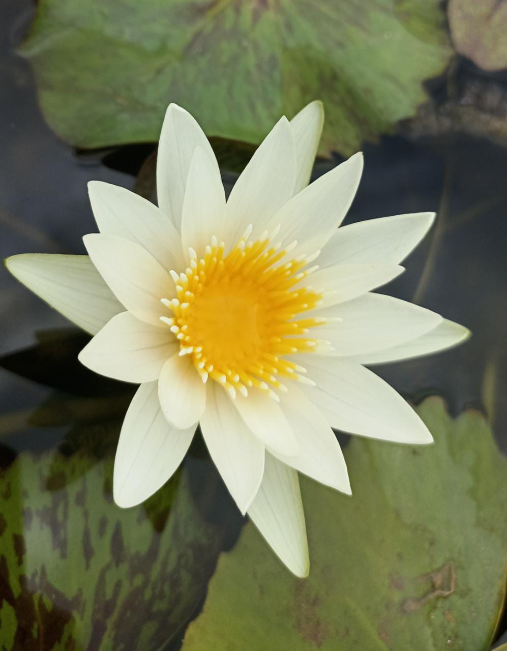 This star shaped creamy white water lily with striking yellow stamens and beautiful mottled leaves is a sure stunner.