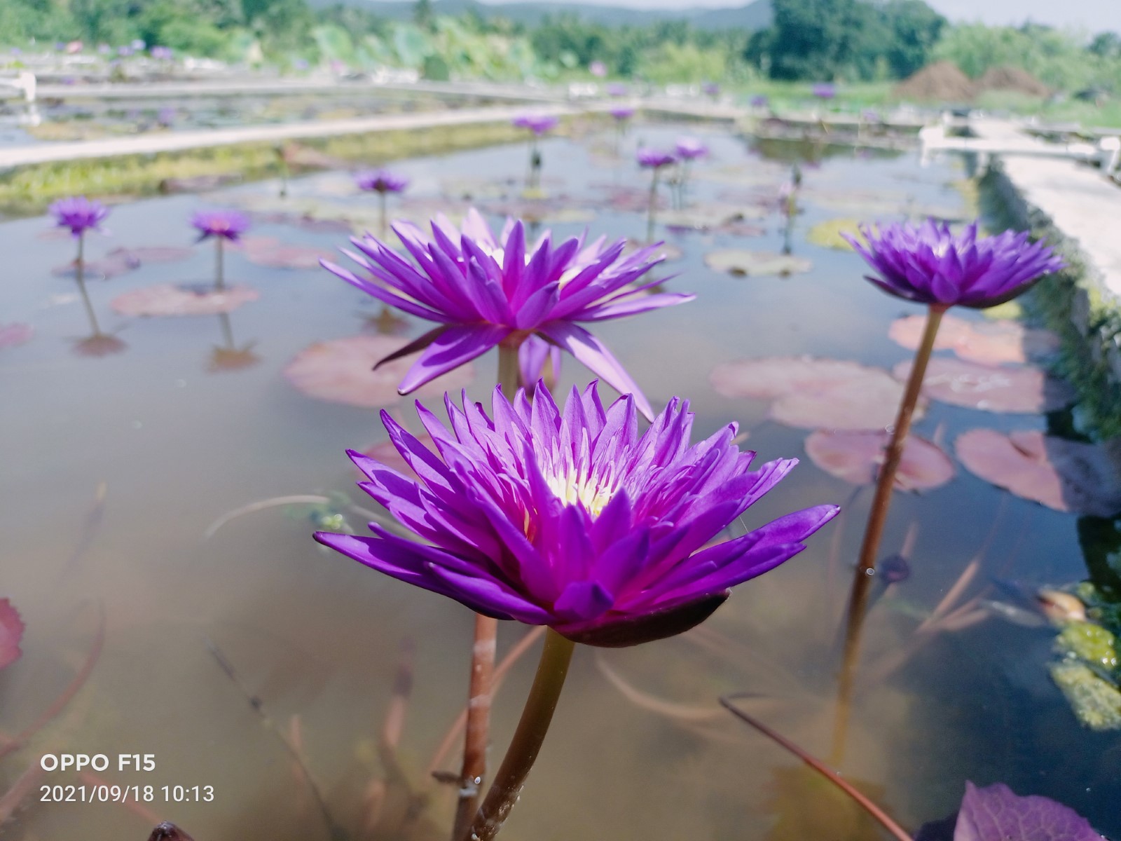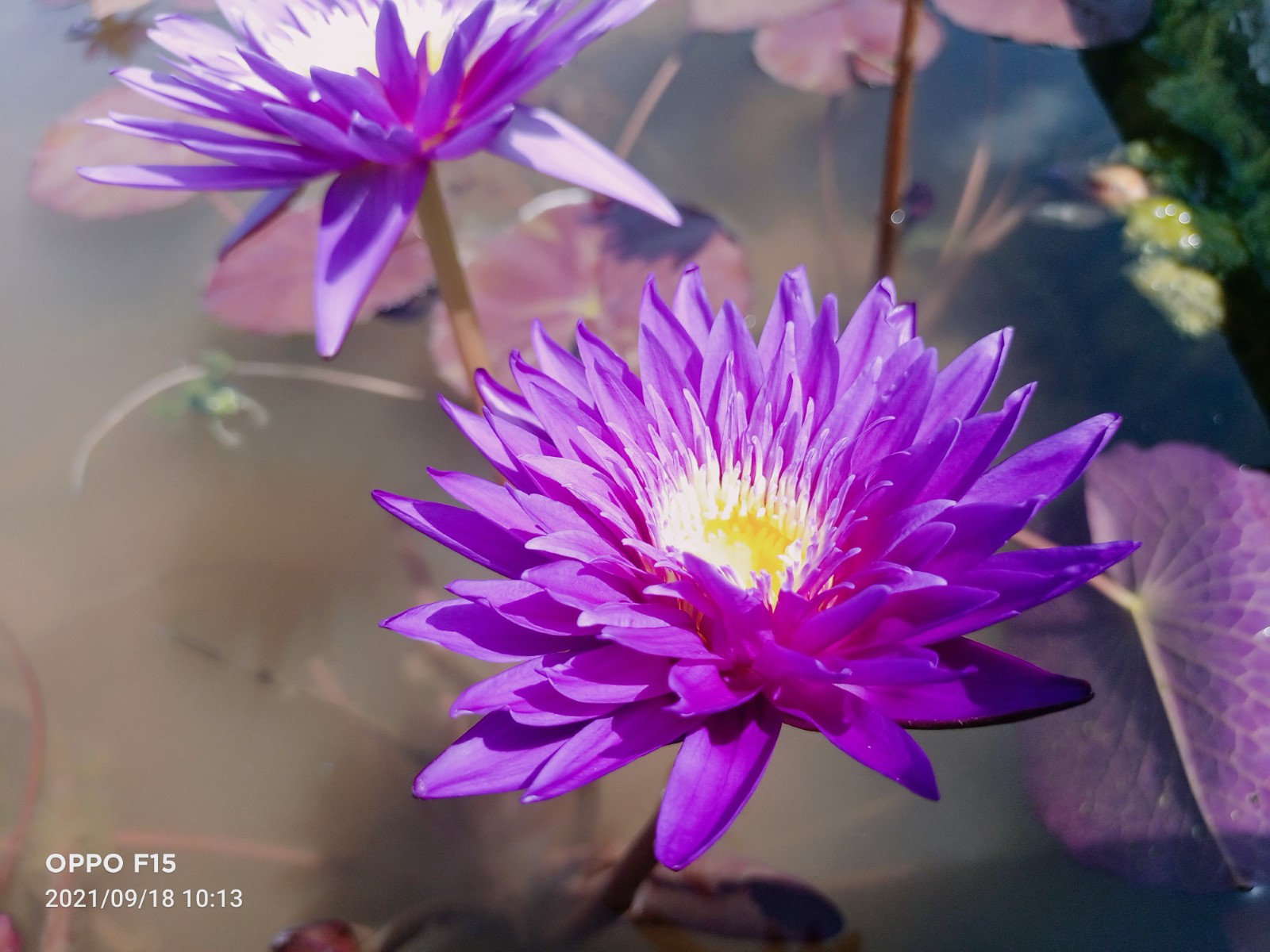 The Galaxy tropical water lily is distinguished by its large, flat petals that span up to 6 inches in width, displaying a captivating deep blue or purple galaxy-like pattern. The vivid yellow stamens of this water lily provide a striking contrast, enhancing its overall allure.