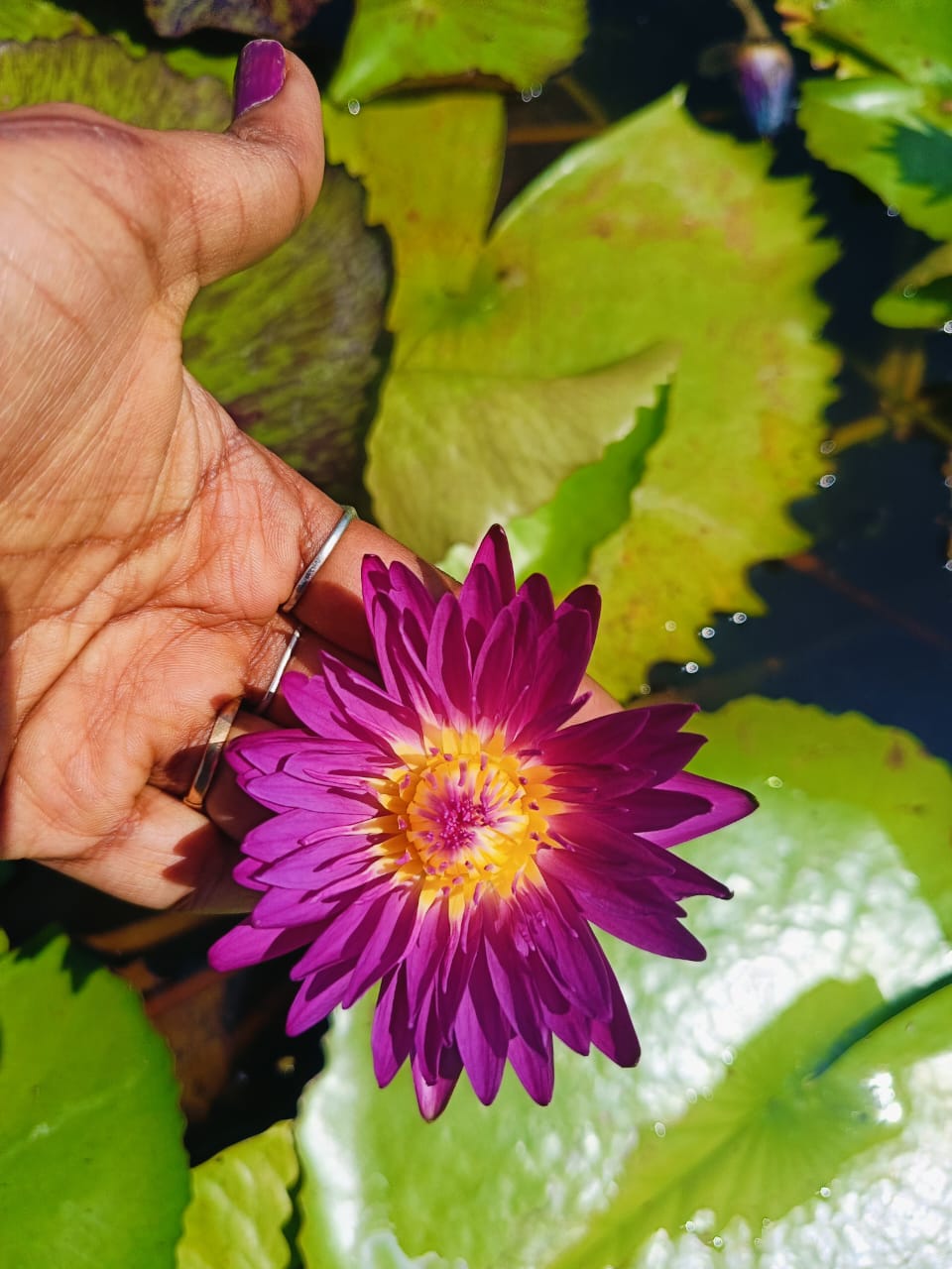 This tropical showcases raspberry pink blooms enhanced by golden yellow in the center. It’s lily pads are large, glossy and bright green. Although it is not a recognized hybrid, we love this local variety as it is blooms profusely and always makes you smile. We highly recommended this tropical as it is beautiful to look at, easy to care for and is thrives well in India.