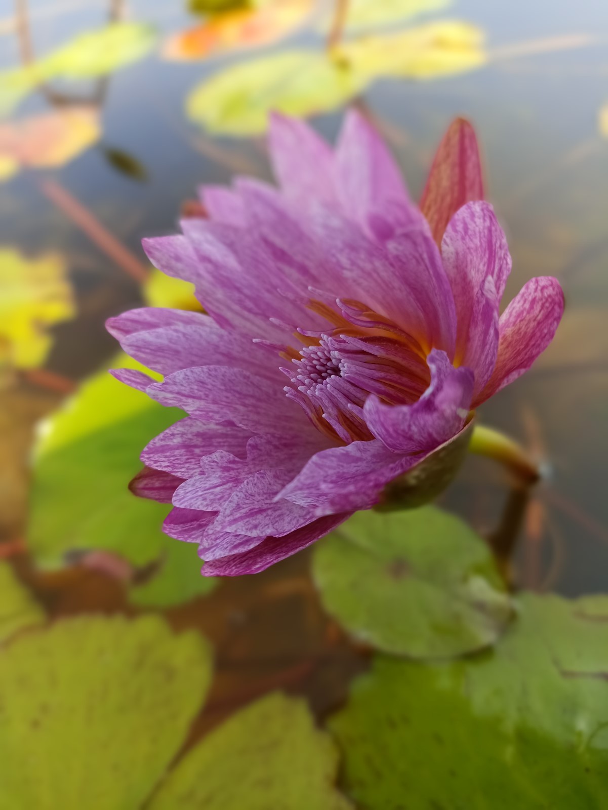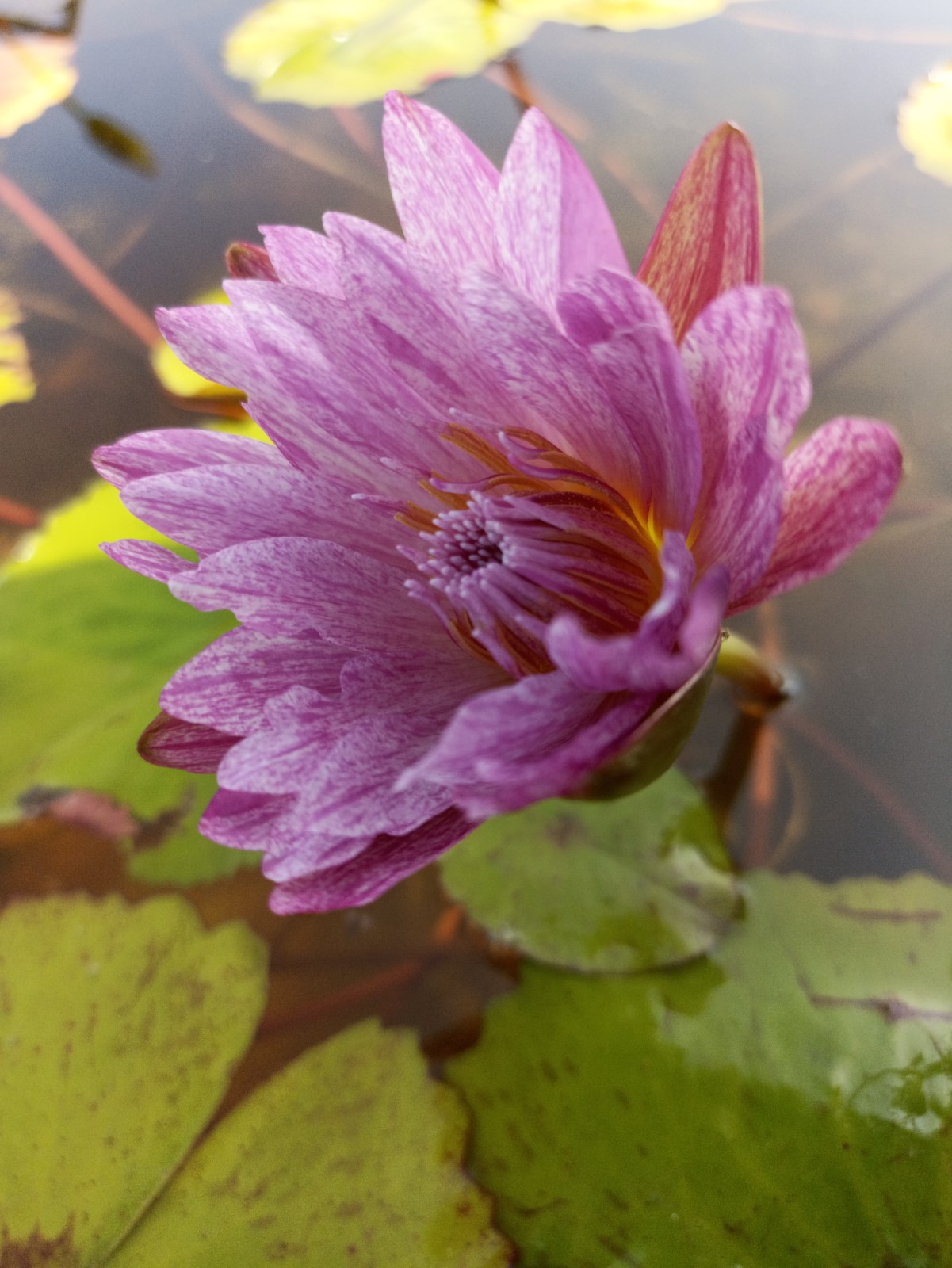 A light pink waterlily with dark pink streaks make this variety very interesting. Lily pads are a beautiful bright green providing excellent contrast.